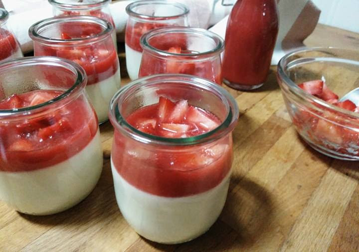 Servir a calda por cima da Panna Cotta e colocar alguns morangos cortados em pedacinhos.