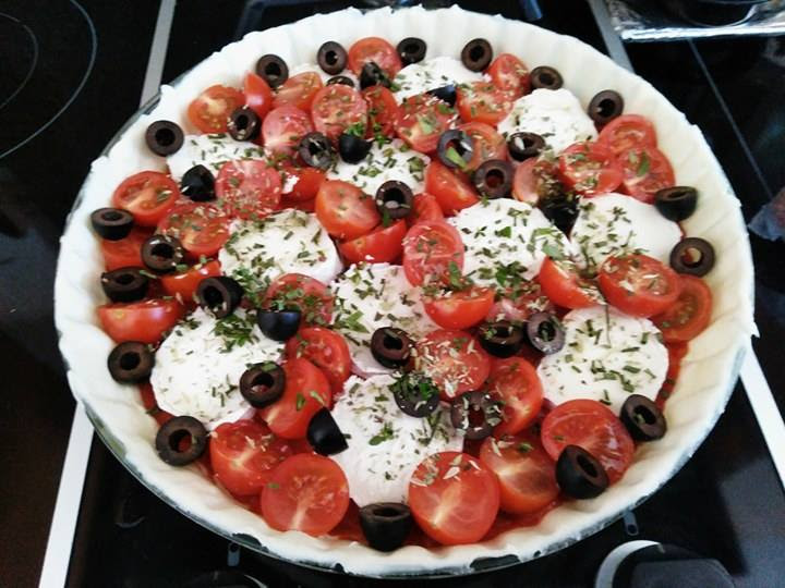 Distribuir este preparado pelo fundo da tarte, adicionar o queijo, os tomates-cerejas e as azeitonas, temperar com sal, pimenta e polvilhar com os orégãos.
