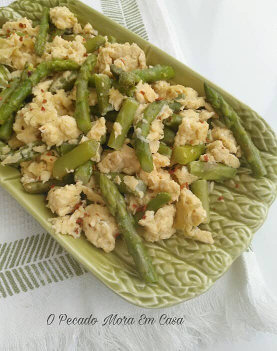 - Numa frigideira colocar um pouco de azeite e os alhos picados, deixar alourar um pouco, juntar os espargos e envolver muito bem, temperar com sal e pimenta.